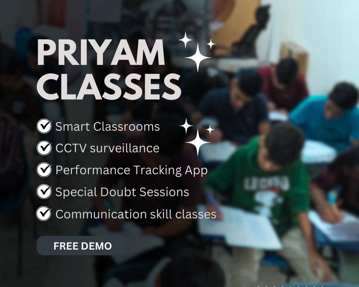 Smart classrooms, CCTV surveillance, personalised attention, experienced faculty, regular progress tracking, one-to-one guidance sessions, and a supportive environment that ensures both academic success and overall growth.